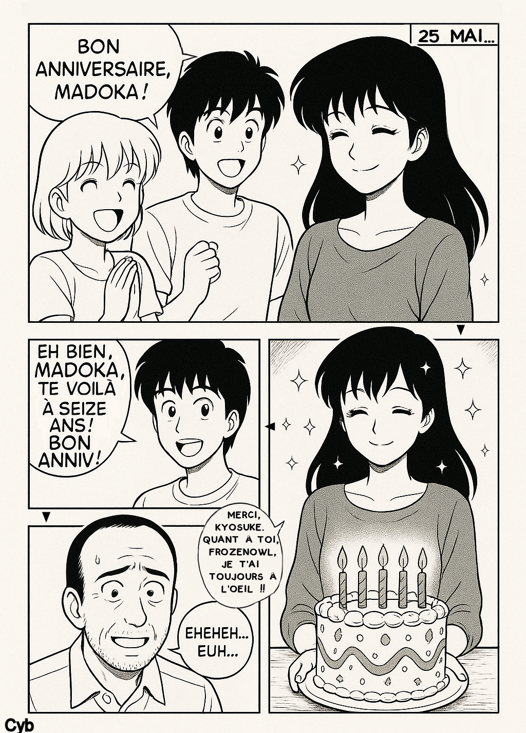 F - Oui, c'est ça. (Aïe.) Gnagneu gnagnignersaire... (N'empêche que je maintiens ce que je dis... C'est quand même elle qui a attendu 16 ans et 18 volumes pour avoir la "grande révélation" que "1 + 1 ne font pas 3"...)