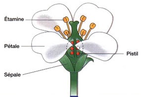 - Les pétales : ils servent aussi à protéger les pièces les plus au centre de la fleur. Ils sont le plus souvent au nombre de 5. Ils sont souvent colorés pour attirer les insectes comme les abeilles ou les papillons.