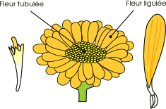 Les fleurs ne sont pas les mêmes au centre et sur le pourtour. On a des fleurs ligulées qui vue de loin ressemble à des pétales et au centre des fleurs tubulées c’est à dire en forme de tube :